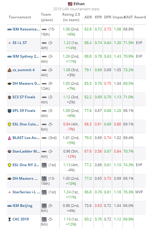 Ethan在2019年的线下赛数据,绿色为高出平均值5%,红色为低于平均值5%,黑色为处于平均值±5%之间